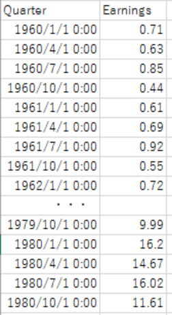 以下のような時系列のデータがあるとします。とある会社の業績データが1960 Q1 から四半期ごとに1980年Q4 まで 84 期 記録されています。