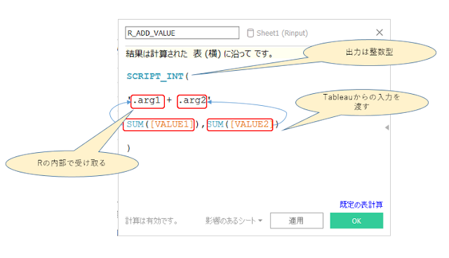 TableauからRのスクリプトを実行するには、SCRIPT_INT関数 (Rからの出力が整数型の場合)や、SCRIPT_REAL関数(Rからの出力結果が実数型の場合) を使って計算フィールドを作成します。