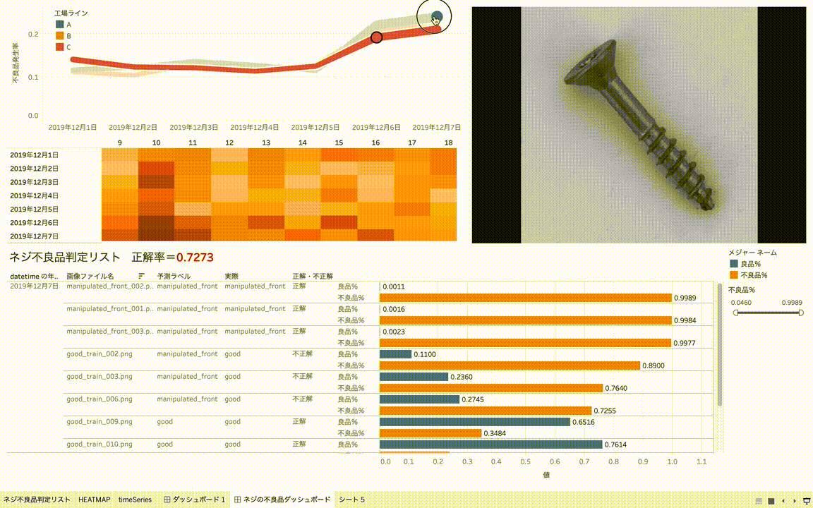 画像ごとに「良品率」と「不良品率」棒グラフで並べ、「不良品率」でソートしてみます。「不良品率」でフィルタをかければ、「不良品率」の高い怪しいネジのみフィルタすることができますね。